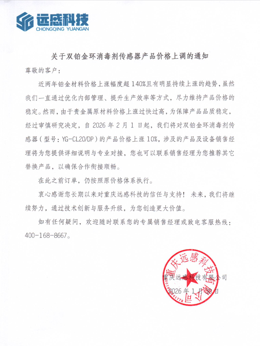 近两年铂金材料价格上涨幅度超140%且有明显持续上涨的趋势,在此期间,我们始终坚守品质初心,虽然我们一直通过优化内部管理、提升生产效率、压缩自身利润空间等方式,尽力维持产品价格的稳定,然而,由于贵金属原材料价格上涨过快过高,为保障产品品质稳定,经公司审慎研究决定,自2026年2月1日起,对双铂金环消毒剂传感器(型号:YG-CL20/DP)的产品价格上调10%,涉及的产品及设备销售经理将为您提供详细说明与专业对接,您也可以联系销售经理为您推荐其它替换产品,以确保紧密合作衔接顺畅。